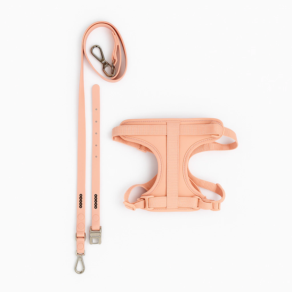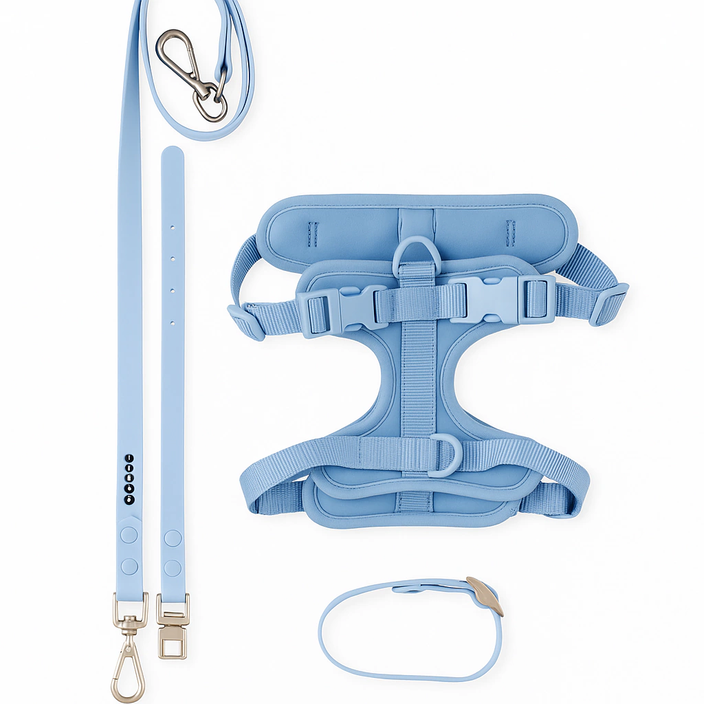 Un paseo con estilo, comodidad y seguridad. El Conjunto Coco’s incluye collar, pretal regulable y correa, todo en un diseño elegante y funcional, ideal para acompañar a tu mascota en cada salida.