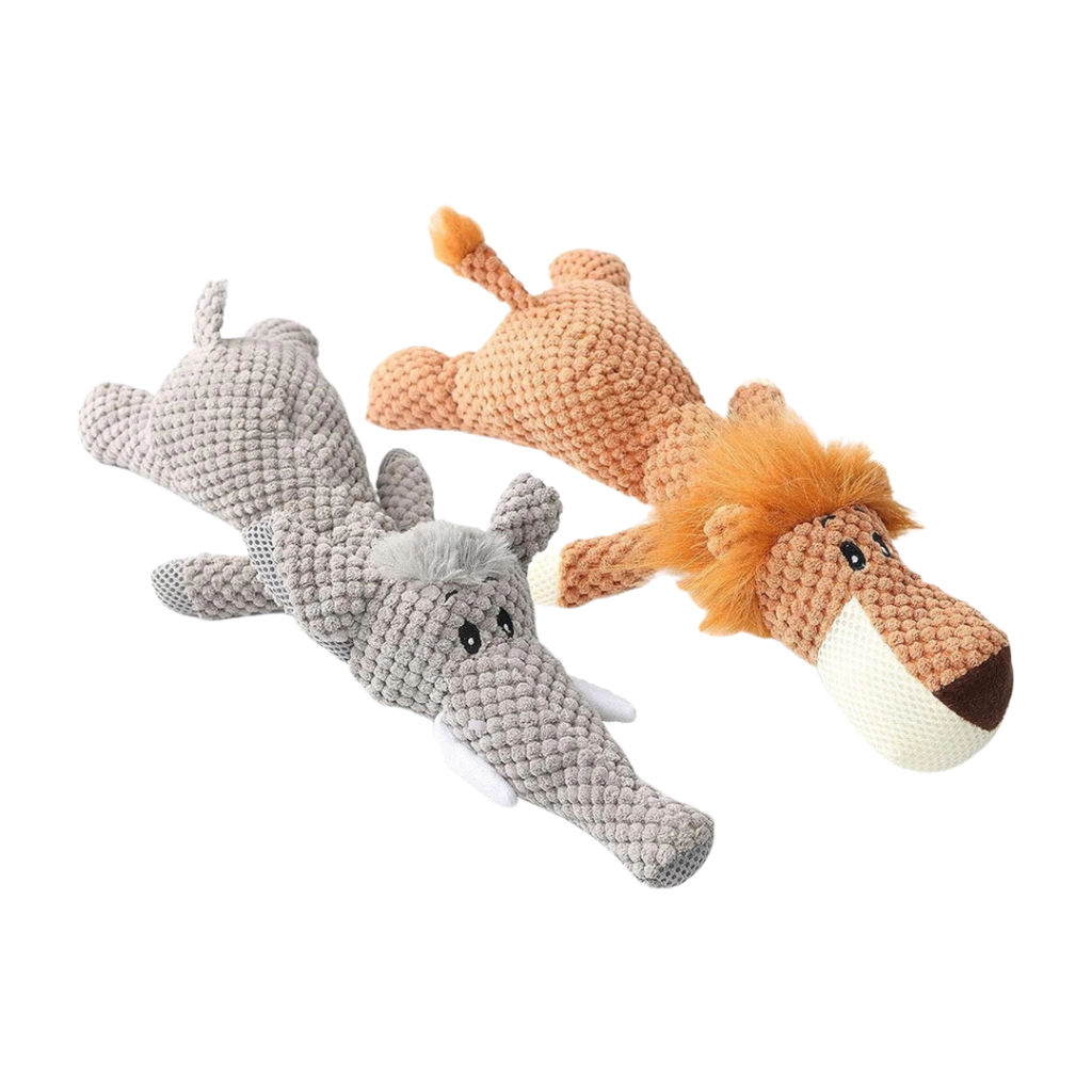 Este juguete para perros viene en formas adorables de león y elefante, diseñados especialmente para cachorros que están descubriendo el mundo a través del juego. Con una medida de 25 cm de largo, es el tamaño ideal para que tu cachorro lo lleve, muerda y abrace sin dificultad.